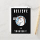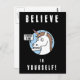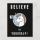 A cartoon unicorn with a resolute expression, "Believe in Yourself" lettering and, "I believe in me" in a word balloon. Color graphic, t-shirts, sweats, cards & gifts.