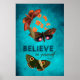 An inspirational and motivational message, "Believe In Yourself", over beautiful vibrant teal background with butterflies and flowers.