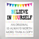 A great poster to hang in a classroom, school guidance counselor office, child therapist or child psychologist to remind kids that they are special, unique and free to be themselves. A great reminder to boost the confidence.
