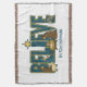 Beautiful nativity scene on a throw blanket with the word "Believe" containing the manger, Jesus, Mary, Joseph, a shepherd, sheep and a donkey. On the back is the scripture from John 3.16. Would make a thoughtful Christmas gift for Christian family and friends.