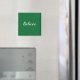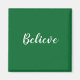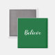 Dark green square magnet with white text. Quote says "Believe".
