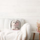 Darling white Maltese puppy dog sitting and posing very nicely on a pretty pink blanket color photograph.