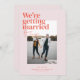 The Belmont save-the-date card showcases a vertical photo that captures the essence of the couple's love, creating a visual centerpiece that speaks volumes. In the top left corner, the bold declaration "We're getting married" steals the spotlight, rendered in a captivating red/orange hue that symbolizes passion and excitement. Directly beneath, the couple's names are delicately written in a handwritten calligraphy style, infusing a touch of personal charm and sophistication.