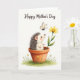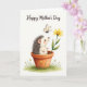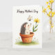 This card features a soft watercolor scene with a small spiky-backed creature cuddled inside a warm terracotta flowerpot, its creamy belly and rosy cheeks giving it an affectionate, bashful look ❤️. A tall yellow flower grows from the same pot, leaning slightly as if keeping the little creature company, like a quiet friendship in bloom. Above them, a tiny pale-winged insect hovers with thin antennae, angled toward the pair as though drawn into their gentle moment. The background stays mostly white, letting the muted earth tones, buttery yellow, and light greens feel airy and calm. Along the bottom, faint strokes of green suggest grass, dotted with a few small yellow buds that echo the flower’s color. Near the top, the words “Happy Mother’s Day” appear centered in a light, warm-toned ink, floating above the illustration with lots of open space around it 🌼. The creature’s eyes tilt upward toward the flower and the hovering insect, and the petals are painted in sunny yellow with a soft brown center.
