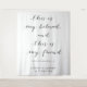 A beautiful statement item perfect as a backdrop for your ceremony, featuring the popular Bible verse "this is my beloved, and this is my friend" Solomon 5:16 in black modern calligraphy style font, with the reference below in small serif font. Personalize with your names and wedding date. Use as decor in your home after your wedding.