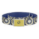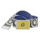 Quilted Star pattern quilt block in yellow, white and dark blue, is tiled across the front. The central "star" is a white with dark yellow ducks. This is surrounded by "petals" of dark blue with red, blue and yellow flowers. Back of belt is dark blue. Buckle is yellow with blue letter that you may personalize.