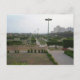The image features a vast, symmetrical park filled with neatly trimmed hedges, paved walkways, and towering green lampposts. The layout is well-structured, with intersecting pathways leading toward a central vanishing point, creating a sense of depth and perspective. A few visitors are scattered across the landscape, adding a lively touch to the serene scene.