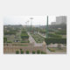 The image features a vast, symmetrical park filled with neatly trimmed hedges, paved walkways, and towering green lampposts. The layout is well-structured, with intersecting pathways leading toward a central vanishing point, creating a sense of depth and perspective. A few visitors are scattered across the landscape, adding a lively touch to the serene scene.