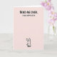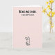 This card features a soft blush-pink background with a cheeky two-line message at the top in black, all-caps sans-serif text reading “BEND ME OVER.” Just below it, a smaller black line adds “I MEAN, HAPPY EASTER.” to flip the tone into a teasing seasonal joke 🌷. The strong black lettering sits centered in the upper half, leaving plenty of open space that makes the words feel even more daring. In the lower third, a simple black outline shows a long-eared bunny from behind, with its back legs planted and its posture suggesting a coy, flirty moment 🐰. The ears stretch upward like two tall points, balancing the heavy text above and giving the layout a tidy, centered look. A tiny tail, shaped almost like a little heart, adds a hint of sweetness to the otherwise sly setup. The bunny is drawn with a single continuous black line against the plain pink field, with no extra scenery or shading.