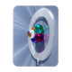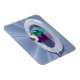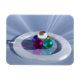 A 3D picture created in Vue, full of reflections and lights shining from all directions. Five colorful spheres of blue, pink, turquoise, orange, and diamond glass stand in a pyramid encircled by a translucent white ring. They sit on a mind-bending background of pale blue and white rays that converge right under the five crystal balls.