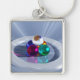 A 3D picture created in Vue, full of reflections and lights shining from all directions. Five colorful spheres of blue, pink, turquoise, orange, and diamond glass stand in a pyramid encircled by a translucent white ring. They sit on a mind-bending background of pale blue and white rays that converge right under the five crystal balls.