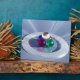 A 3D picture created in Vue, full of reflections and lights shining from all directions. Five colorful spheres of blue, pink, turquoise, orange, and diamond glass stand in a pyramid encircled by a translucent white ring. They sit on a mind-bending background of pale blue and white rays that converge right under the five crystal balls.