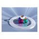 A 3D picture created in Vue, full of reflections and lights shining from all directions. Five colorful spheres of blue, pink, turquoise, orange, and diamond glass stand in a pyramid encircled by a translucent white ring. They sit on a mind-bending background of pale blue and white rays that converge right under the five crystal balls.