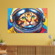This digital artwork by Otis Porritt presents a striking Bengal cat peering from within an astronaut's helmet. Rendered with vibrant, saturated colors and bold outlines, the feline's emerald eyes captivate against its orange and black striped fur. The background explodes with a dynamic interplay of red, yellow, and blue, adorned with splatters and cosmic spheres, creating a lively, pop art-inspired universe. The crisp lines and graphic style emphasize the adventurous spirit of this unique space explorer.