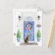 Announce your new address with our stylish announcement featuring a Bengal cat, blue front door, welcome mat, slate sign, topiaries and a floral wreath set on a gray brick background.