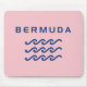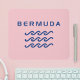 Stylized design shows three ocean or water waves and the word "Bermuda" above in a cool modern text. Design is all-blue. Bermuda pink background color.