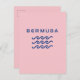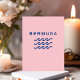 Stylized design shows three ocean or water waves and the word "Bermuda" above in a cool modern text. Design is all-blue. Bermuda pink background color.