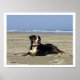 Photograph of a Bernese Mountain dog enjoying a sandy beach.