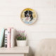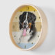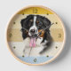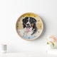 A portrait of a beautiful Bernese Mountain Dog is the feature on this clock. The image is placed on a retro, slightly distressed striped sunset background. Dark gold numbers and diamond shaped markers around the perimeter make the clock easy to read. Perfect for anyone who has lost their heart to a Berner.