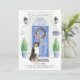 Announce your new address with our stylish announcement featuring a Bernese Mountain Dog, blue front door, welcome mat, slate sign, topiaries and a floral wreath set on a gray brick background.