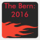 Bernie Sanders bumper sticker featuring black background, orange font and orange side-flame. Reads, The Bern:2016.