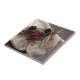 a warm comforting setting with pinecones, twine, berries and greenery for the holidays with graphics of Happy Holidays. What a great hot plate trivet for the holidays. photography and fabric art by kaps images
