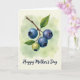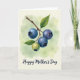Designed with a delicate botanical illustration, this vertical card features a slim brown branch curving through the upper center, as if leaning in close like a gentle friend ❤️. Four round berries hang along the stem, three in deep indigo and violet with a soft sheen that makes them look freshly picked. A fourth berry sits lower and lighter in chartreuse and yellow, adding a sweet sense of growing alongside the others 🌼. Each fruit is topped with a small star-shaped cap, giving the smooth surfaces a tiny touch of texture and care. Behind the branch, a watercolor-style wash blends mint green with creamy yellow, like sunlight drifting through leaves. Near the bottom, the words “Happy Mother’s Day” appear in flowing deep navy lettering, centered and spaced to balance the artwork above. The leaves are bright green with subtle veins, fanning outward around the berries against the pale, airy background.