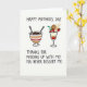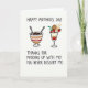 Designed with a bright white background, the card centers on two dessert cups that feel like a sweet shared treat between close hearts ❤️. On the left sits a striped goblet in warm earth tones with a single red band, holding a chocolate-brown dessert dotted with lighter specks, with two slim spoons leaning together as if two people are about to take a bite at the same time. On the right, a tall stemmed glass shows neat layers of deep red, warm beige, and creamy white, stacked like a careful gift. Its top is crowned with red berries, two golden wafer sticks, a round biscuit-like piece, and a few green leaves, suggesting a small, cozy celebration 🌼. Across the top, “HAPPY MOTHER’S DAY” appears in large, dark lettering, arched to frame the desserts. Near the bottom, the message “THANKS FOR PUDDING UP WITH ME! YOU NEVER DESSERT ME.” is set in smaller, dark text, centered beneath the illustrations. The two desserts sit side by side with generous spacing, and the right glass is slightly taller, drawing the eye upward to the berry-and-wafer garnish.