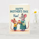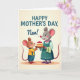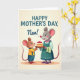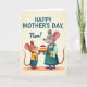 This card shows two upright, human-like rodent characters sharing a sweet kitchen-style moment, with the taller grey-furred figure leaning in as if touched by the offering ❤️. She has pink-lined ears, rosy cheeks, and a gentle smile, wearing a muted teal apron with a checkered towel tucked at the side and a pink beaded necklace. In front of her, a smaller brown-furred figure in a bright yellow shirt and blue overalls lifts a layered cake with a proud, affectionate grin, as though presenting a treat made just for her. The cake sits centered between them with creamy white frosting and shiny red berries piled on top, drawing the eye like a shared secret dessert. The background is a soft creamy wash with a mild glow, and a faint oval patch under their feet grounds the scene without distracting from their close, friendly posture 🌼. Near the top, the message “HAPPY MOTHER’S DAY, Nan!” appears in large, dark lettering, spaced evenly above their heads. The taller figure’s eyes angle down toward the cake while the smaller one looks up toward her, their faces close and warmly lit. The red berries gleam against the white frosting, and the teal apron stands out softly against the pale backdrop.