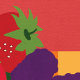 This illustration is a whimsical grouping of strawberries, blackberries, raspberries, marionberries, and green leaves. In the background is a striped tablecloth. The image is a digital image of hand-painted paper. Colors include red, purple, blue, coral, orange, yellow, fuchsia, and dark pink. Inside Blank for any occasion.