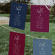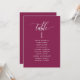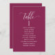 Help your guests find their table with this elegant modern seating plan cards with guests names. Double sided cards so guests can look from both, front or back for their names. Clear space all around giving you the liberty to use clips or punch hole for hanging displays, or use table holder/frame. Berry background and white text. Modern hand written calligraphy details. Several color options. Have all table numbers in same color or mix colors according to your event's color theme. Part of our "Berry, Blue and Burgundy Floral" collection.