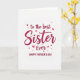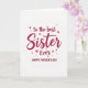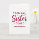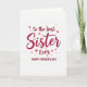 This card features a white background with the main word “Sister” centered in large, flowing lettering, colored in a deep berry tone with a soft gradient that adds gentle depth ❤️. Above it, the smaller phrase “to the best” sits near the top in a lighter berry shade, aligned to complement the larger word below. The word “Ever” appears close to “Sister,” matching the richer color and curving style so the two lines feel like they’re leaning toward each other in a tender, affectionate way. Scattered around the text are many small heart shapes in crimson, magenta, and soft coral, drifting like a cheerful confetti trail 🌼. These hearts cluster more densely near the center and thin out toward the edges, creating a cozy, romantic frame around the message. Along the bottom, “HAPPY MOTHER’S DAY” is set in simple uppercase lettering in a darker tone for clear contrast and easy reading. The layout stays airy with plenty of open space, making the berry lettering and hearts stand out sharply against the white. The hearts vary slightly in size and angle, with several tiny ones floating near the top and a few larger ones sprinkled beside the main word.