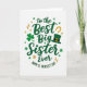 This greeting card features the message “to the Best Big Sister Ever” stacked down the center in flowing emerald-green lettering, with a soft shadow that gives the words a gentle lift 💚. A small shamrock stands in for a dot within the wording, adding a sweet little wink that feels like an inside joke between close siblings ☘️. Near the bottom, “HAPPY ST. PATRICK’S DAY” curves in smaller green text, tucked neatly under the main message. The background stays bright white, making the greens and warm gold accents stand out clearly. Around the lettering, you’ll spot a four-leaf clover, a leprechaun hat with a gold buckle, and tiny gold horseshoe and starburst details that feel like they’re sprinkled in celebration. The hat sits above the word “Sister,” like it’s been set there with an affectionate, teasing touch. Deep and lighter greens mix through the design, while the gold details glint beside the central text on the white background.