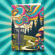 Wishing you the best birthday by par. A unique colorful disc golf course in a field of retro mushrooms, pine trees, colorful swirling clouds in vintage colors like blue, green, pink and orange.
