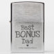 Personalized stepfather zippo lighter featuring the text "best bonus dad" in a cute handwritten font, a love heart, and their names underneath.