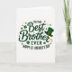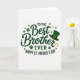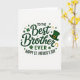 This greeting card centers on the message “TO THE Best Brother EVER HAPPY ST. PATRICK’S DAY,” arranged in stacked lines that feel like a proud shout and a warm nudge between siblings. “Best Brother Ever” sits in the middle in deep emerald green lettering, while the surrounding words appear above and below in darker green uppercase text for contrast. A bright white background keeps everything crisp, letting the greens and golds stand out without crowding the page. Small shamrocks are scattered around the wording like little winks, hinting at an easy friendship and the kind of teasing grin you’d share over a holiday toast 💚. Near the top, a green leprechaun hat tilts at an angle with a shiny gold buckle, adding a light, celebratory touch ☘️. A curved golden horseshoe sweeps nearby, echoing the hat’s curve and framing parts of the message. Tiny clover shapes and starburst-like accents fill the open spaces around the text, with green and gold details balanced across the white field.