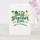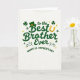 This greeting card features a St. Patrick’s Day message centered on a bright white background, with “to the Best Brother Ever” in rich green lettering that feels like a warm, friendly shout-out 💚. The word “Best” gets extra attention, topped with a small green leprechaun hat with a gold buckle, like a cheerful wink between siblings. A shiny gold horseshoe, dotted with tiny black marks, cleverly stands in for the “U” shape within the word, adding a lucky twist ☘️. Beneath the main line, “Happy St. Patrick’s Day” sits lower and curves gently in matching green, keeping the layout balanced and easy to read. Around the text, small three-leaf shamrocks scatter like confetti, mixing with tiny four-point gold stars that add sparkle without crowding the space. Under “Ever,” light curling flourishes in green trail outward, giving the design a soft, affectionate finish. The overall palette stays mainly emerald green and gold, with the hat, horseshoe, shamrocks, and stars spaced neatly around the centered lettering.