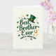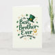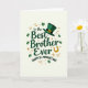 This card features an ivory background with large emerald-green lettering in the center that reads “to the Best Brother Ever,” giving the message a close, friendly feel 💚. Above and around the words, small gold stars and tiny asterisk-like flourishes scatter like confetti, adding a lively St. Patrick’s Day sparkle. A slightly tilted green leprechaun hat with a gold buckle sits near the top, as if it’s been tipped in a teasing, affectionate hello. Nearby, a gold U-shaped horseshoe brings a lucky touch, its shading suggesting a soft metallic shine. Shamrocks in a few different green tones dot the open space, balancing the lettering and keeping the layout airy. The main text stays front and center in green, while the gold accents frame it like warm little nods of appreciation ☘️. The composition is sprinkled with shamrocks, stars, and the hat and horseshoe clustered around the central line of text on the pale background.