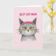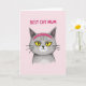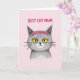 Designed with a soft pastel pink background, the card centers on an anthropomorphic grey tabby cat shown from the head to the upper torso, drawn with visible colored-pencil texture. Its luminous yellow eyes with long dark pupils give a knowing, affectionate look, as if it’s sharing a quiet inside joke with someone it adores ❤️. A small dark nose, a gently curved mouth, and fine dark whiskers keep the face sweet and friendly. A bright fuchsia headband sits across its forehead, adding a fun splash of color that echoes the warm, celebratory mood. The pointed ears are shaded with deeper pink inside, framing the face in a balanced, tidy way. Across the top, the message “BEST CAT MUM” appears in bold, hand-drawn uppercase letters in matching fuchsia, centered above the character 🌼. The grey fur shows layered pencil strokes and soft shading, while the background stays smooth and uniform in pale pink.