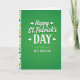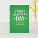 This card features an emerald green background with a soft radial gradient that adds depth behind the main greeting. Centered near the top, the text reads “Happy St. Patrick’s DAY” in bright white, with “Happy St. Patrick’s” in flowing cursive-style lettering and “DAY” in crisp capital letters, both lightly shadowed for lift. Just below, “BEST DAD EVER” sits in a sturdy white sans-serif, turning the holiday message into a close, affectionate nod to someone special 💚. A small four-leaf clover icon rests between the main greeting and the dedication, acting like a gentle divider. Along the left edge, a vertical white stripe forms a border filled with repeating shamrocks that feel like a friendly parade beside the words ☘️. The shamrocks alternate in green, sunny yellow, and warm orange, with tiny green dots scattered between them for extra texture. The final look is anchored by that left-side shamrock border against the deep green field, with the white lettering centered and easy to spot.