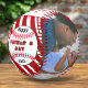 Best Dad Happy Father`s Day Red Stripes 2 Photo Baseball. The text overlays two baseball balls and the background is a red stripe pattern. Personalize it with 2 photos, your name and year. This personalized baseball is a perfect gift for a dad on Father`s Day, birthday or Christmas.