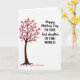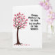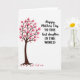 This greeting card features a bright white background with a stylized tree on the left, drawn with a sturdy dark-brown trunk and wide-reaching branches. The canopy is packed with fuchsia-pink leaves or blossoms, creating a rounded shape that feels like a gentle hug, and a few petals rest near the base as if they’ve just drifted down. On the right side, the text reads “Happy Mother’s Day TO THE best daughter IN THE WORLD,” arranged in a tall, easy-to-scan stack. “Happy Mother’s Day” and “best daughter” appear in a flowing cursive-style lettering that adds a tender, affectionate tone ❤️. “TO THE” and “IN THE WORLD” are set in black, all-cap letters that stand out with firm emphasis against the open white space. The limited palette—pink foliage, brown wood, and black text—keeps the layout calm and balanced, with plenty of breathing room between the tree and the words. A small scatter of pink petals sits along the lower left edge beneath the tree’s canopy 🌼.