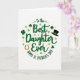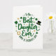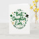 This greeting card features a white background with a circular layout of St. Patrick’s Day text and lucky symbols that frame a close, affectionate message 💚. In the center, “Best Daughter Ever” appears in large, flowing deep emerald-green lettering that draws the eye first. Around it, smaller uppercase text curves in a ring, reading “to the Best Daughter Ever HAPPY ST. PATRICK’S DAY,” with the green letters spaced to form a neat medallion shape. Scattered around the words are several shamrocks in different greens, from light lime to darker forest tones, giving the page a gentle, friendly energy ☘️. Tiny golden starbursts sparkle between the clovers, adding little flashes of celebration without crowding the design. A small gold horseshoe sits toward the lower left area, while a black leprechaun hat with a bright gold buckle rests near the upper right. The greens and golds stand out sharply against the white space, with the clovers and starbursts floating around the centered lettering. In the upper right, the leprechaun hat tilts slightly, its gold buckle catching the light beside a nearby shamrock.