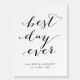 A beautiful statement item perfect as a wedding welcome board, featuring the phrase "best day ever" in black modern calligraphy style font. Personalize with your names and wedding date. Use as decor in your home after your wedding.
