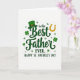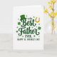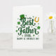 Designed with a bright white background, this St. Patrick’s Day card centers on the message “to the Best Father Ever, Happy St. Patrick’s Day” in layered green lettering 💚. “Best Father Ever” sits largest in deep emerald across the middle, with “to the” placed smaller above it and “HAPPY ST. PATRICK’S DAY” set below in a steadier, classic style. A little leprechaun hat rests near the top of the wording, its buckle picked out in gold, like a proud finishing touch. Around the text, shamrocks and four-leaf clovers in lighter greens drift across the space, creating a gentle sense of closeness, like a warm hand on a shoulder ☘️. The clovers vary in size and spacing, guiding your eye in a relaxed loop from top to bottom. A gold horseshoe tilts upward near the lower area, adding a bright accent against the greens. The hat, clovers, and horseshoe are scattered around the centered text on the white field.