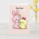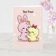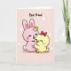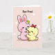 This card shows a sweet digital illustration of two friendly, humanlike animals cuddled close, with a tender, almost romantic closeness in the way their cheeks press together. In the center sits a rounded, long-eared pink bunny with eyes softly closed, a wide smile, and rosy cheek dots, plus a small white-and-yellow flower tucked near one ear 🐰. Hugged against its side is a smaller yellow bird with a tiny beak and little wings, also smiling with closed eyes and a gentle blush, wearing a bright red bow on its head. Their arms wrap around each other in a snug embrace that reads like loyal friendship you can see, not just words. The background is a pale pastel pink with scattered soft white circles that float around them like light bokeh. Near the top, the phrase “Best Friend” is placed above the characters in a thick, hand-drawn style, shown in a dark tone that stands out clearly. Small details add warmth, including the bunny’s fluffy tail and the bird’s lightly suggested feather texture 🐇. The red bow tilts slightly to one side, and the white circles are spaced unevenly across the pink backdrop.