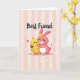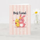 This design shows two animated-style friends cuddling close, with a pastel pink long-eared bunny 🐰 wearing a yellow flower tucked behind one ear and a round, sunny yellow little bird with a small red bow on its back. Their bodies curve toward each other in a snug embrace, and their closed eyes and wide smiles suggest a tender bond that feels like friendship with a hint of romance. Soft, gentle lighting adds a faint glow around their faces, keeping the mood light and sweet. Above them, the words “Best Friend” sit near the top in dark lettering with flowing, cursive-like strokes. The background is filled with vertical stripes in light pink tones, creating a cozy, springtime setting. Scattered white floral shapes and tiny red hearts float around the pair, like little notes of affection in the air 🌷. The pink striped backdrop alternates between slightly different blush shades, with the white flowers and red hearts spaced evenly around the hugging characters.