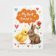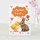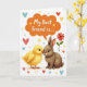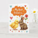 This card shows a fluffy yellow chick and a gentle brown bunny-like animal touching noses, their wide eyes meeting with a tender, best-friends kind of closeness 🐰. The pair sits centered on a white background that keeps the focus on their soft feathers and fur. Above their heads, an orange, cloud-shaped speech bubble holds the words “My Best Friend is....” in darker lettering that stands out clearly. Around them, small hearts in red, blue, and yellow float like little notes of affection between the two. Tiny gold star shapes are sprinkled in to add a light, celebratory sparkle without crowding the scene. Off to the right, a single red flower adds a sweet, thoughtful touch, like a small gift set down nearby 🌷. The chick’s bright yellow and the bunny’s earthy brown create a gentle contrast against the white space, with the orange text bubble drawing the eye upward. The hearts and stars sit scattered around the characters, and the red flower is placed to the right side of the pair.