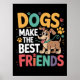 This heartwarming graphic features a cheerful, light brown cartoon puppy with a happy expression and outstretched tongue, sitting contentedly. Bold, multi-colored text in various fonts declares "DOGS MAKE THE BEST FRIENDS," accented by colorful paw prints in yellow, blue, and pink. The design is set against a solid black background, making the vibrant message pop. Digital download for personal use only.