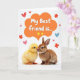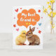 This greeting card shows a bright yellow baby bird with soft, downy feathers leaning in to touch noses with a small, fawn-colored bunny 🐰, their shiny eyes aimed at each other with a tender, curious look. The bird’s tiny tongue peeks out slightly, adding a sweet, friendly closeness to the moment. They sit centered on a white background that keeps the focus on their gentle interaction. Near the top, an orange cloud-shaped label holds the words “My Best friend is...” in a darker, easy-to-read tone, spaced neatly across the middle of the cloud. Around the pair, small hearts in red, pink, and blue float like confetti, hinting at warm companionship without needing extra words 🌷. A few stylized red flowers dot the scene, adding little bursts of color that frame the animals without crowding them. Fine fur and feather details give both characters a soft texture, especially along the bunny’s ears and the bird’s fluffy chest. The orange cloud sits above the animals while the hearts and flowers are scattered lightly across the white space.